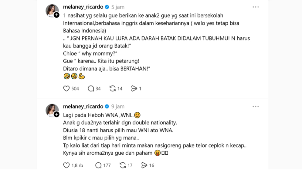 Di tengah ramainya perdebatan, Melaney Ricardo ikut bersuara melalui media sosial. Ia menyinggung isu WNA dan WNI yang sedang ramai diperbincangkan.