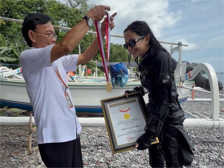 “Karena aku Indonesia banget, jadi aku daftarkan ke MURI dan menyelam di Laut Tulamben, Bali. Kenapa di sana, karena peralatan yang lengkap dan memadai di sana,” jelasnya.