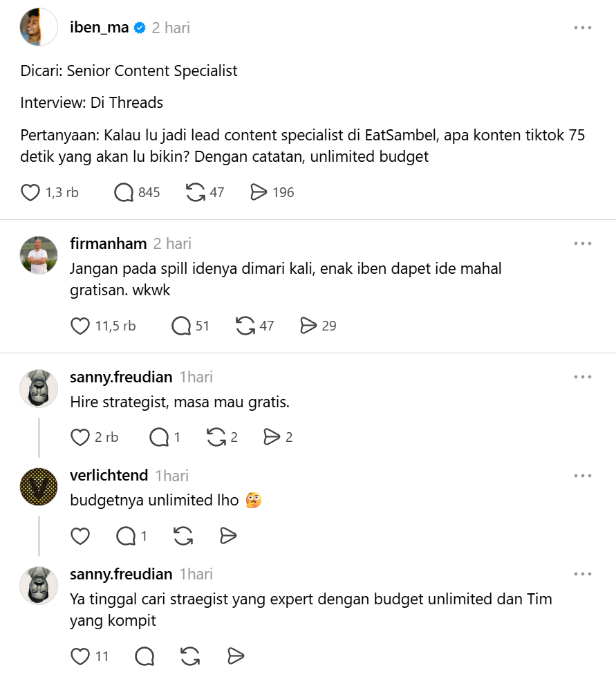 Salah satu komentar yang viral bahkan mengingatkan pelamar agar tidak sembarangan membagikan ide. “Jangan pada spill idenya di sini, enak dapat ide mahal gratisan,” tulis netizen, yang kemudian diamini banyak pengguna lainnya.